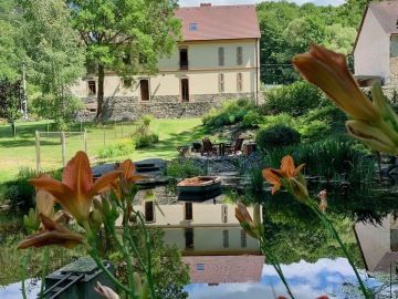 Impozantní zahrada s vlastním rybníkem, s přírodně čistou vodou, nabízí osvěžení v horkých letních dnech a relaxaci ve dnech, kdy se můžete jen zaposlouchat do šumu majestátních stromů doprovázeného nekonečným zručením potoka. Zahrada, jejíž součástí je i dětský koutek, skýtá mnohá zákoutí pro grilování, rodinný odpočinek, nebo jen pro přečtení dobré knížky s nevšední kulisou a klidem.