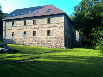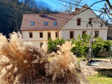 Vodní mlýn z 18. století najdete v malé obci Byňov ležící několik kilometrů od Labe v oblasti mezi Děčínem a Ústím nad Labem. Homolský potok lemuje nepříliš frekventovaná silnice kde po necelých třech kilometrech jízdy z Velkého Března najdete pár stavení tvořících vesničku Byňov. První písemné zmínky o Passtreicherově mlýně na Homolském potoce se objevují v 18. století. Starou mlýnici najdeme na vojenském tzv. josefském mapování z doby Habsburské monarchie. Na Homolském potoce se v té době nacházelo bezmála čtrnáct vodních mlýnů na vzdálenosti ani ne 15 km. V novověku byl mlýn doplněn o druhou, Novou mlýnici, v níž se nachází naše ubytování. Na tehdejší dobu patřil soubor mlýnských budov o rozměrech 60 x 22 m k opravdu mohutným stavbám. Kamenné zdivo ze zdejšího znělce (druh magmatické vyvřeliny) má v patě domu šíři 120 cm a v obvodovém zdivu budovy pak 80 cm. Pohon mlýna zajišťovalo vodní kolo (pozůstatky vodního díla prochází rekonstrukcí) o jehož parametrech víme dle soupisu z roku 1930, že bylo na svrchní vodu (tzv. korečník) s hltností 0,043 m3/s a na spádu 7,5 m dávalo výkon 2,2 HP. Zásobování mlýna vodou zajišťovaly dva zásobní rybníčky spojené 500m náhonu. Vodní dílo a kolo na rekonstrukci zatím čekají, ale co by to bylo za mlýn bez klapajícího kola. Mlýn byl nájemní a posledními nájemními mlynáři byli sudetští Hanlové. Není bez zajímavosti, že jsme v kontaktu s jejich potomky, kteří se několikrát během rekonstrukce na mlýně zastavili a jim také vděčíme za některé historické fotografie. Jsou u nás vždy vítanými hosty stejně jako Vy.