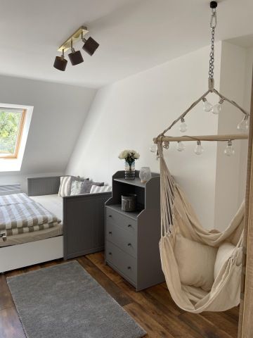 Podkrovní apartmán (3NP) v dispozici 3+KK s předsíní. Útulný podkrovní apartmán s výhledeme na všechny strany usedlosti. Obývací pokoj s plně vybavenou kuchyní, Sedací gauč (bez možnosti přistýlky), HD TV (via Internet), krbová kamna, rozkládací jídelní stůl ( až 6 míst). Vybavení kuchyně : lednice s mrazničkou, indukční varná deska (4 plotýnky), trouba na pečení, myčka na nádobí, kávovar Nespresso (6 náplní zdarma, další za poplatek), prostorný dřez a přípravná deska, kompletní sada pro vaření, kompletní sada servírovacího nádobí. Velké množství odkládacích skříněk. Ložnice s manželskou postelí, nočním stolkem, komodou a šatní skříní. Dětský pokoj s rozkládací dvojpostelí (plnohodnotná postel i pro dospělé), věšákem, komodou a houpací sedačkou. Koupelna s WC, vana kombinovaná se sprchou se zástěnou, umyvadlo.