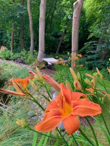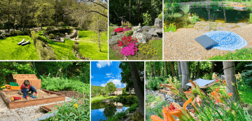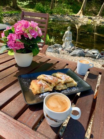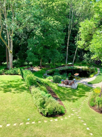 Naše zahrada nemá být skvostem zahradní architektury s japonskými lampičkami a dlážděnými chodníčky, je to místo pro odpočinek, relaxaci a spojuje Mlýn Byňov s okolní přírodou. Vždyť ledňáček, datel, obří vážky a další obyvatelé biotopu našeho přírodního jezírka a zahrady jsou důkazem toho, že se nám spojení se staletým listnatým lesem úspěšně podařilo. Voda v našem rybníčku pochází z přírodního prameniště, jistě není průzračná jako chlorovaná voda moderních bazénů, ale je čistá, s parametry pitné vody. Pokud se tedy při koupání a plavání ve 170 cm hlubokém jezírku napijete, nic vám nehrozí (nicméně koupání je na vlastní nebezpečí). Udržovaná zahrada vás pak překvapí nesčetnými zákoutími, protékajícím potokem, kde si děti mohou stavět přehrady a dovádět, tedy pokud je nebudou studit nohy (do potoka doporučujeme koupací obuv). Grilovací místa na zahradě umožňují příjemné večerní soukromí u dobrého jídla a pití. Zapůjčení veškerého potřebného vybavení je samozřejmostí, v případě servisu účtujeme drobný poplatek. Děti v zahradě ocení dětský koutek s trampolínou a pískovištěm. Pro zdatnější jsou k dispozici elektrické čtyřkolky za poplatek. Lanové spojení s lesním domkem v korunách stromů je prozatím ve výstavbě.